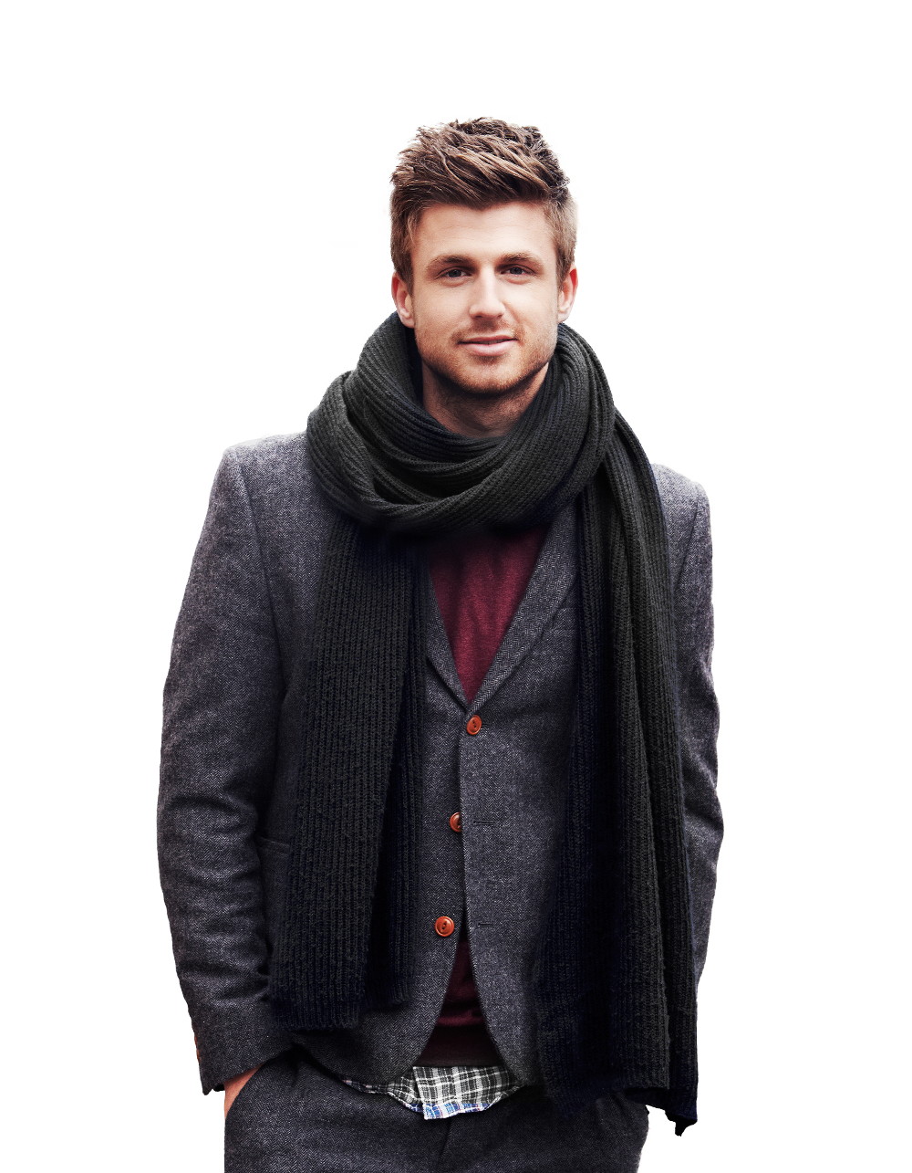 Harmaa bleiseri punaisilla napeilla